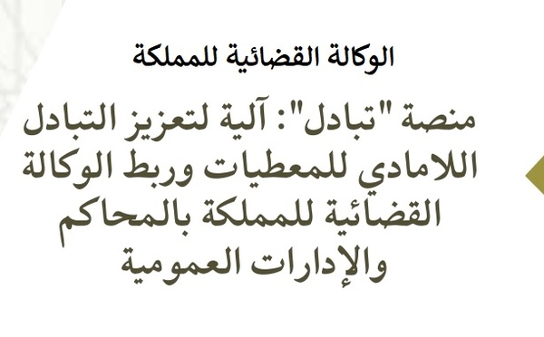 ﻣﻨﺼﺔ "ﺗﺒﺎدل": آﻟﻴﺔ ﻟﺘﻌﺰﻳﺰ اﻟﺘﺒﺎدل اﻟﻼﻣﺎدي ﻟﻠﻤﻌﻄﻴﺎت ورﺑﻂ اﻟﻮﻛﺎﻟﺔ اﻟﻘﻀﺎﺋﻴﺔ للمملكة ﺑﺎﻟﻤﺤﺎﻛﻢ واﻹدارات اﻟﻌﻤﻮﻣﻴﺔ