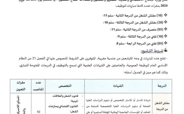 إعلان توظيف 35 متصرف ومفتش شغل "تخصص القانون" بوزارة الإدماج الاقتصادي والمقاولة الصغرى والتشغيل والكفاءات - اخر أجل 2024/4/12