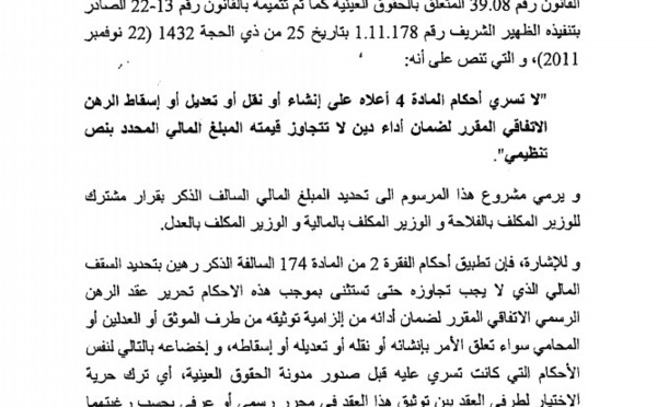 مشروع نص تنظيمي محال عليه ضمن المادة 174 من مدونة الحقوق العينية والمحدد للسقف المالي الذي لا يجب تجاوزه عندما يتعلق الأمر بإتفاقات ضمان الدين حتى تستثني من أحكام المادة الرابعة من المدونة المذكورة