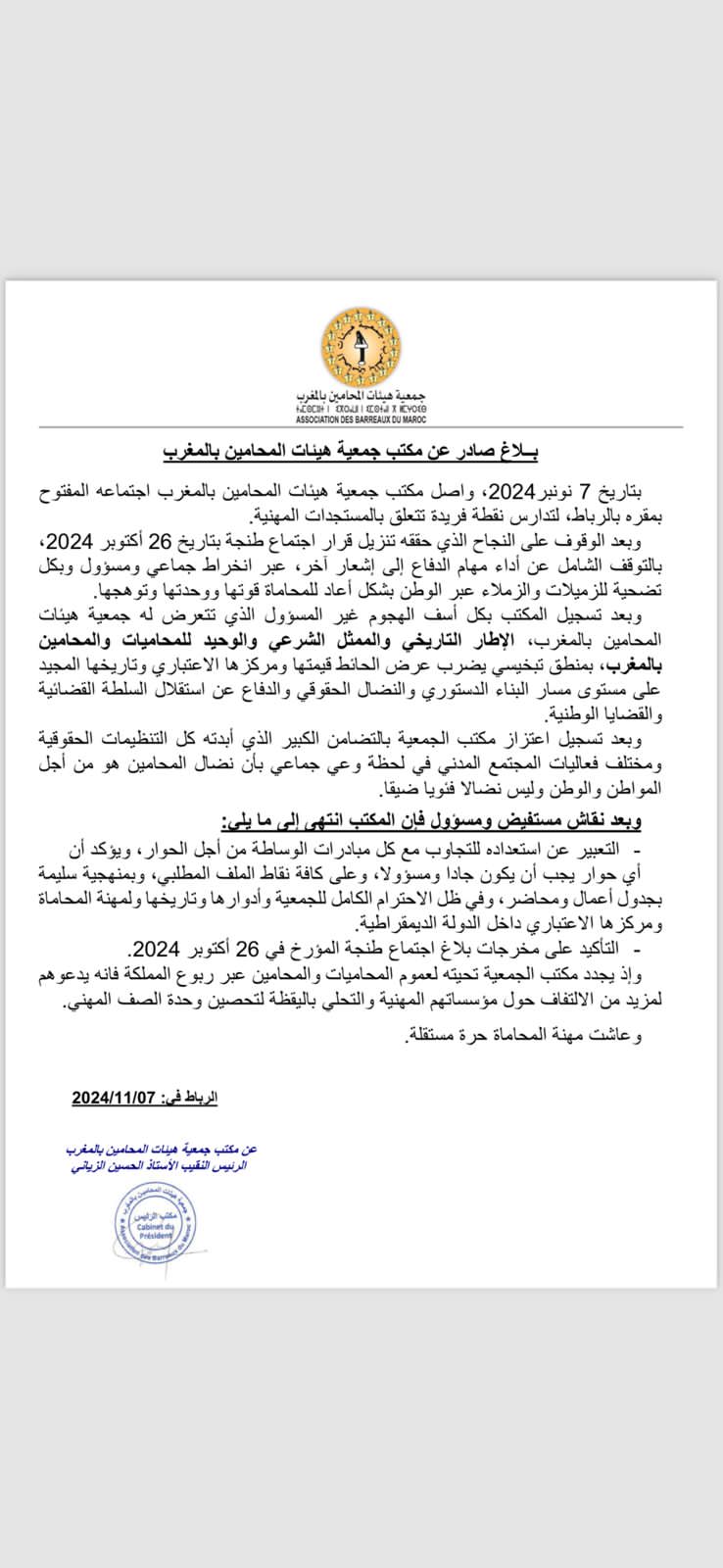 جمعية هيئات المحامين تتأسف للهجوم الذي تتعرض له وتؤكد الالتزام بمخرجات اجتماع طنجة